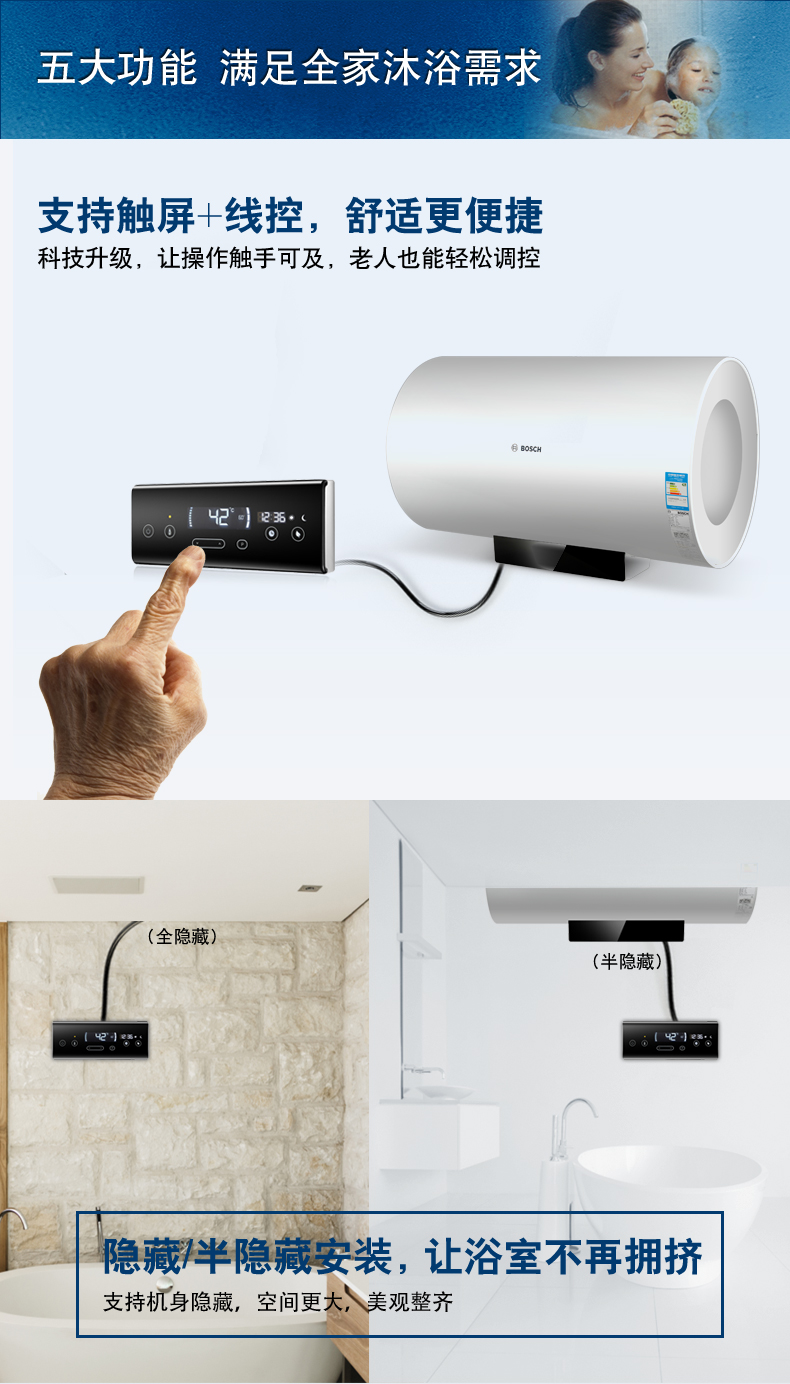 電子式控制,無機體控制器,遠程線控器,可隱藏或半隱藏安裝。可選容積為50L/60L/80L/100L。