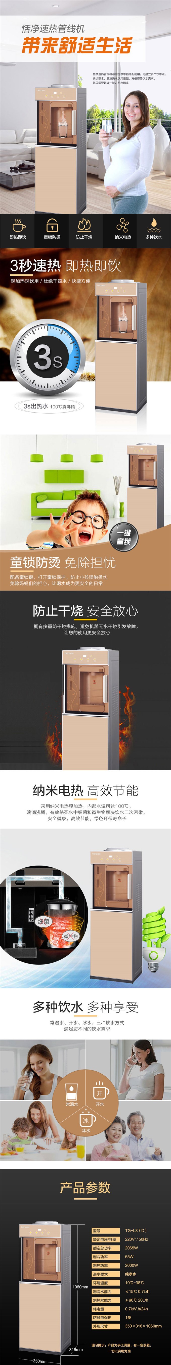 恬凈速熱管線飲水機(jī)TG-L3(D),采用納米電熱膜加熱技術(shù),有效殺死水中的細(xì)菌微生物,防治二次污染。3秒速熱,隨時(shí)可喝上熱水。恬凈速熱管線飲水機(jī)TG-L3(D)自帶防干燒系統(tǒng)與童鎖,安全省心。